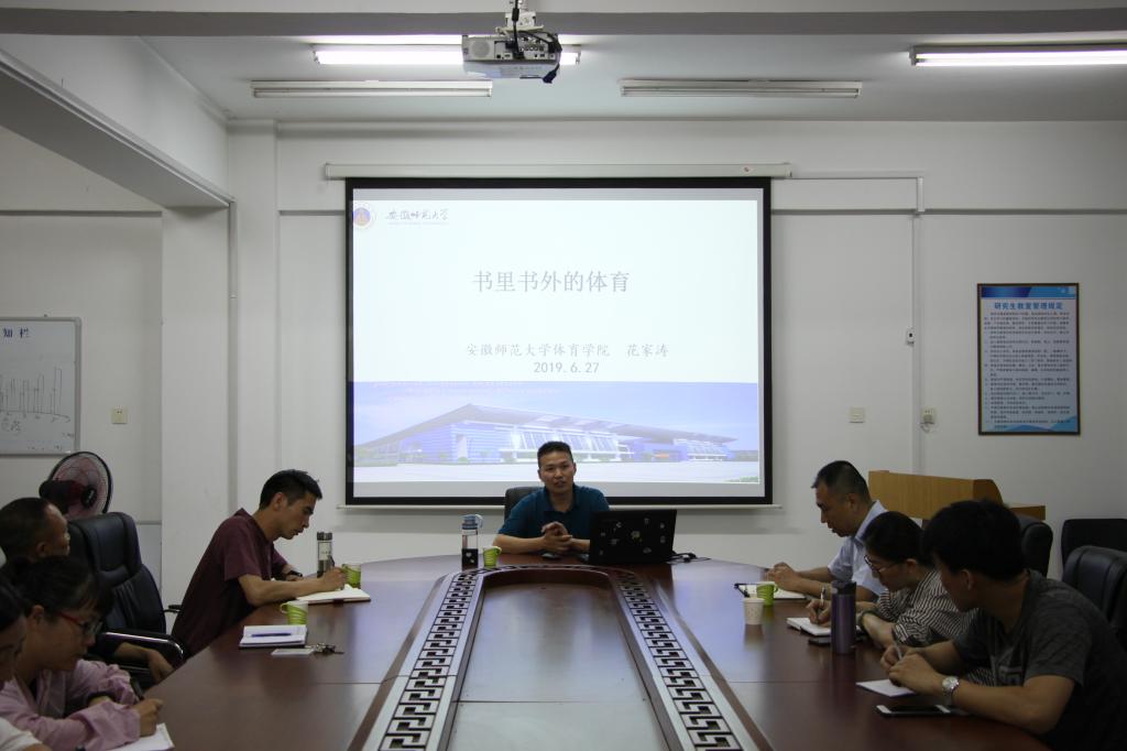 6月27日下午安徽师范大学博士生导师花家涛教授受足球现场直播 邀请来我校讲学,此次学术讲座的主题为《书里书外的体育》的讲座,讲座学科部副主任、民族传统体育学学术方向负责人宿继光主持,足球现场直播 教师及研究生参加了此次会议。