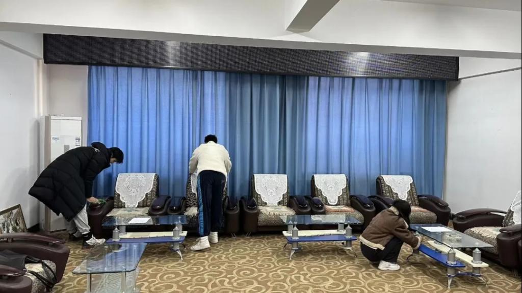 中午12:10同学们准时到达院楼一层集合,此次活动一共分为五个小组,每个小组各自负责一部分区域,领取所需工具后大家便分工有序全情投入劳动,对足球现场直播