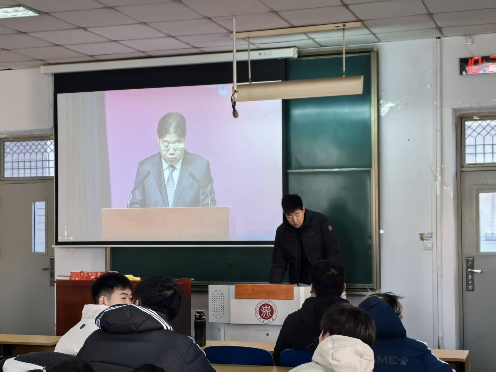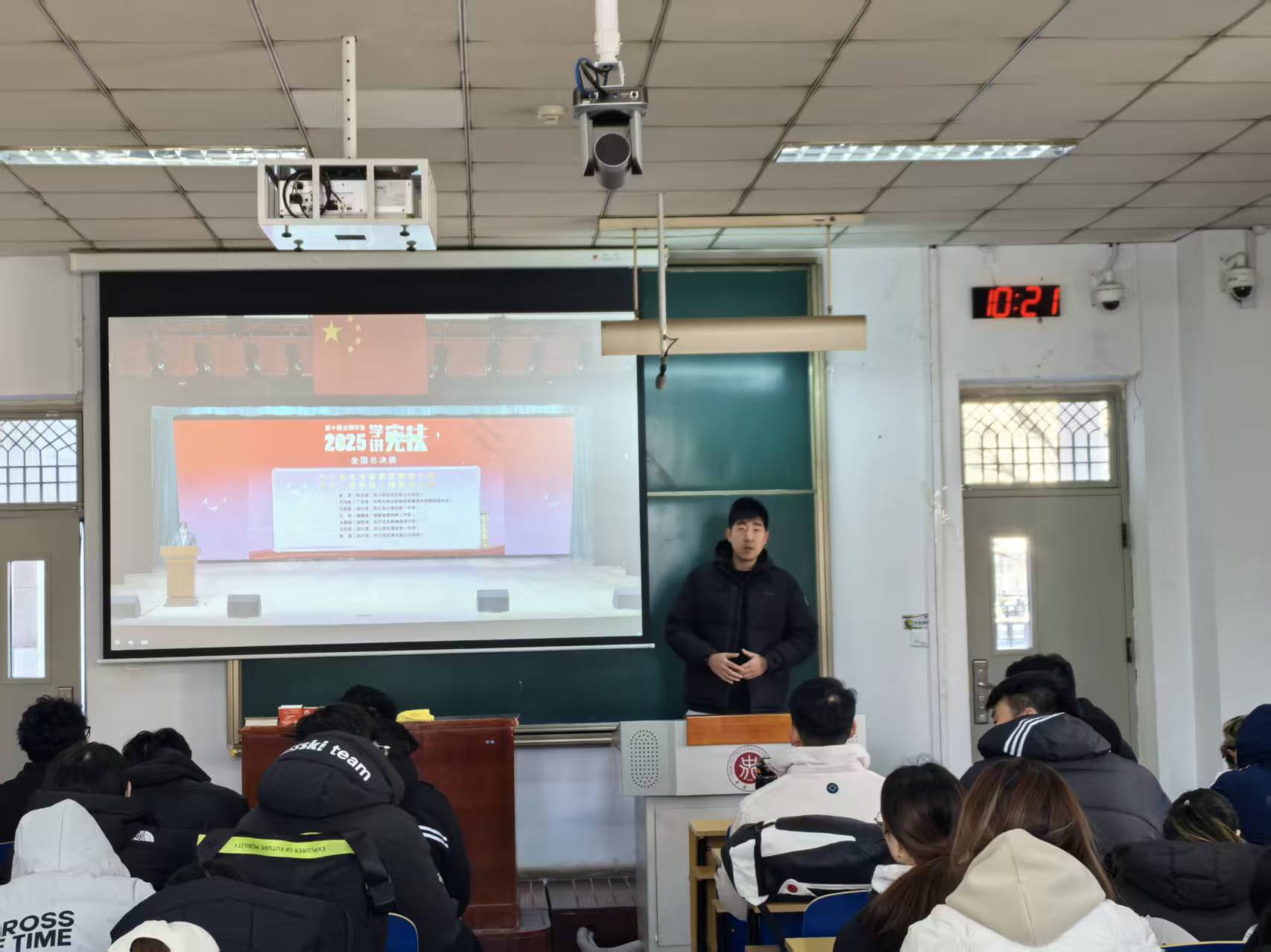 组织100余名学生集中观看教育系统“宪法晨读”活动,现场由辅导员李佳怿统一组织协调。