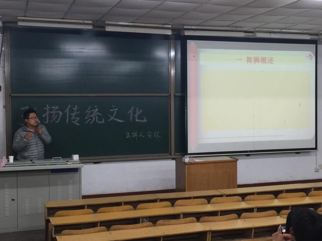 唐伟老师为本次班会的主题做了总体的概述,同时阐述了开展本次班会的意义!接着安琛学长为我们详细介绍了舞龙舞狮项目的文化,以及其在我国的地位。同时,安琛学长希望这项传统文化可以在中北大学得到一个更好的推广,鼓励并向出席本次班会的成员发出邀请。