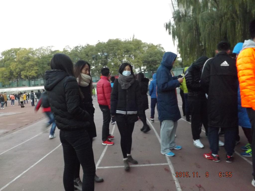 14级15级同学,早晨准时来到操场,他们在操场上整齐排列。王老师老师和足球现场直播