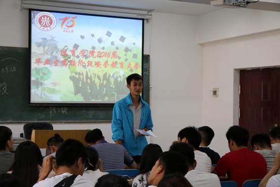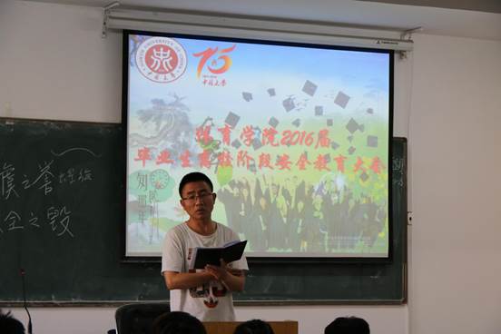 会议室召开了“2016届毕业生安全教育大会”,参加本次会议的有党总支副书记贾鹏、学生科科长李士荣、团委书记唐伟、学生科辅导员王华慧以及12级全体毕业生。