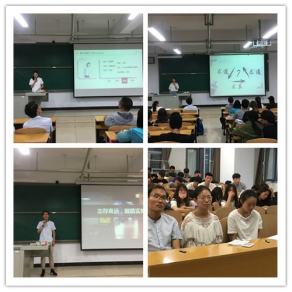 的闫晓敏同学结合自己的经历,用三个阶段“求通”、“求道”、“求真”给大家诠释了“厚积薄发,为而不争”的精神。最后闫晓敏同学用《大学》中的一段话为结尾:“大学之道,在明明德。在亲民,在止于至善。知止而后有定,定而后能静,静而后能安,安而后能虑,虑而后能得。物有本末,事有终始,知所先后,则近道矣。”