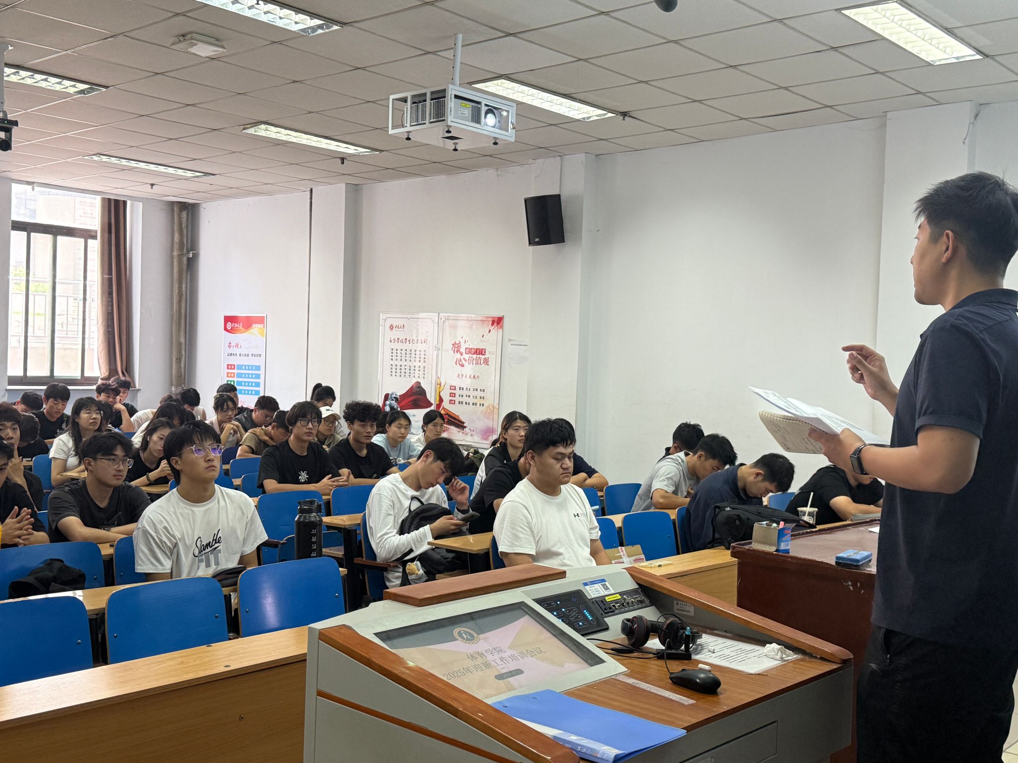 培训最后,李老师对全体工作人员提出要求:希望大家严格遵守工作纪律,明确分工、各司其职,同时加强沟通配合,形成工作合力,全力为2025级新生提供贴心、周到的服务,让新生感受到足球现场直播