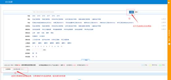 选课页面中选择主修课程或者板块课程,点击查询按钮,查询后下方显示可选的教学班。