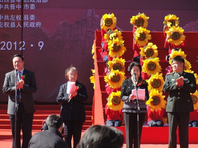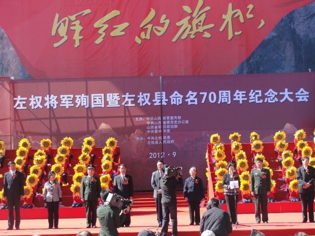 由中宣部、山西省省委宣传部主办,山西广播电视台、左权县委、县政府承办的“左权将军殉国暨左权县命名70周年大型文艺演出”于9月28日在左权麻田八路军纪念馆隆重举行。省委副书记金道铭、省委宣传部部长胡苏平、左权将军女儿左太北及抗日将军后代出席了本次庆祝活动。