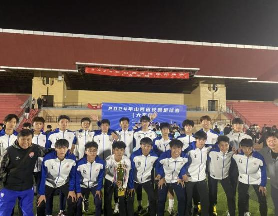 我校校园组足球队教练由周杨老师和李纲老师担任。在小组赛中,我校足球队三战全胜,以9粒进球0丢球的成绩,小组第一进入淘汰赛。淘汰赛第一场,我校5比0山西财经大学晋级半决赛;半决赛面对实力强劲的山西大学,从领先到被扳平,再到被反超。但我校队员永不言弃、团结一致,最终以3比2的比分,逆转山西大学,昂首挺进决赛;在决赛面对太原理工大学,我校足球队队员依旧保持必胜的信念,严格执行教练布置的技战术,最终以3比1的比分战胜太原理工大学,获得了山西省大学生校园足球赛男子二级联赛冠军。