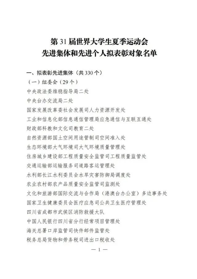 2024年2月4日,中共四川省委、四川省人民政府、教育部、国家体育总局联合印发了《关于表彰第31届世界大学生夏季运动会先进集体和先进个人的决定》,表彰在本次世界大学生运动会中成绩显著、贡献突出的先进集体和先进个人。其中,足球现场直播比分网