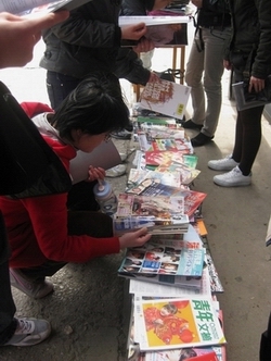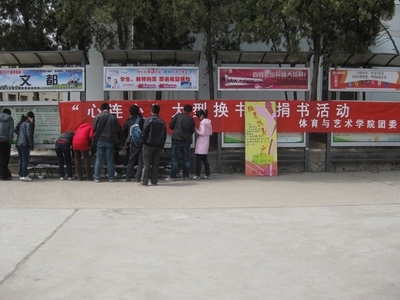 4月14号中午12时,在中北大学一食堂门前,由体育与艺术足球现场直播 团委办公室主办的“心连心”大型换书、捐书活动开始。本次活动面向全校同学,收集各类图书。活动目的主要有两方面,一是图书交流,让同学把手中闲置书籍换成自己感兴趣的书;二是回书捐赠,把同学们的图书捐赠给贫困山区的儿童。活动收集到的图书题材、内容以及种类多种多样,涵盖了多方面知识。
