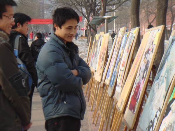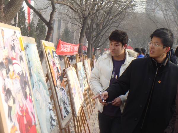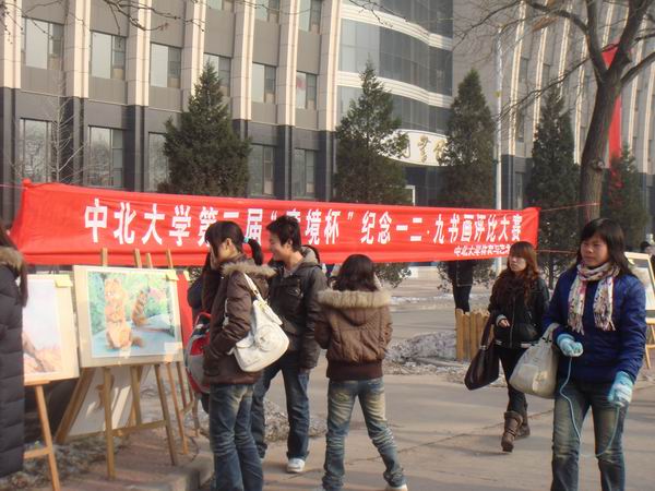 12月9日上午10:30,在中北大学图书馆门前,由体育与艺术足球现场直播 举办的纪念“一二·九”运动七十四周年“意境杯”书画展在如火如荼的场面中举行。