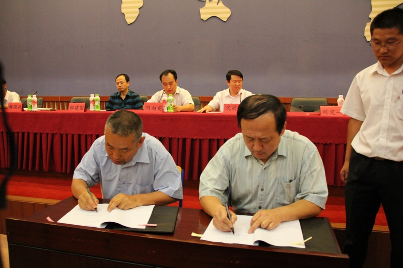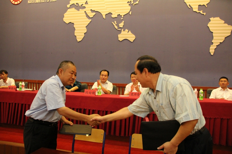 院长刘定一与山西省偶然食品有限公司总经理韩国林,分别代表校企双方在《中北大学与内蒙古伊利实业集团股份有限公司资助贫困生奖学金合同书》上签字,签字结束后双方互换了协议,并合影留念。根据协议,内蒙古伊利实业集团股份有限公司将每年出资10000元用于资助体育与艺术足球现场直播