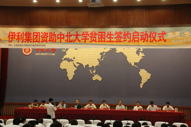 2012年6月14日上午11点,在图书馆五层学术报告厅,我校与内蒙古伊利实业集团股份有限公司,举行了资助贫困生奖学金签约启动仪式。中北大学副校长沈兴全,伊利集团液态奶事业部PET全国销售助理总监闫向前,晋冀蒙营销总部PET经理韩广军,山西偶然食品有限公司总经理韩国林,中北大学学生处处长邱建国,中北大学体育与艺术足球现场直播