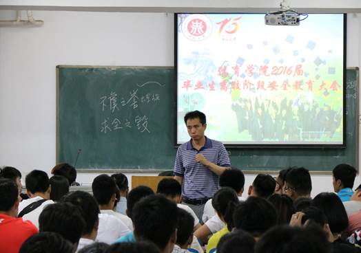 会议室召开了“2016届毕业生安全教育大会”,参加本次会议的有党总支副书记贾鹏、学生科科长李士荣、团委书记唐伟、学生科辅导员王华慧以及12级全体毕业生。
