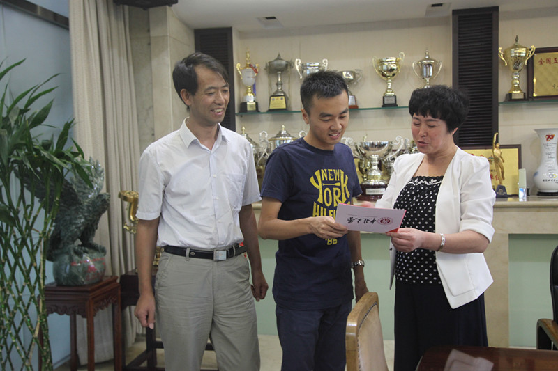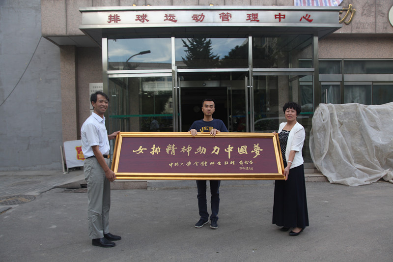 负责人受学校委托驱车赴京,代表全校师生向中国女排赠送“女排精神助力中国梦”的匾额,匾额由我校党委副书记薛智亲笔题写。临行前,校党委书记李忠人、校长刘有智殷切嘱托送匾人员务必要将我校师生的拳拳心意传达给中国女排。历经6个小时车程,一行人顺利到达国家体育总局排球运动管理中心,将凝聚了全校师生寄托与祝福的匾额和写给中国女排的信交给总局排管中心工作人员,由他们转交给中国女排。