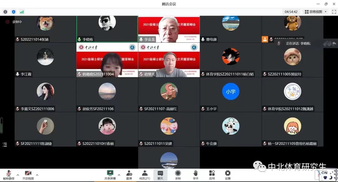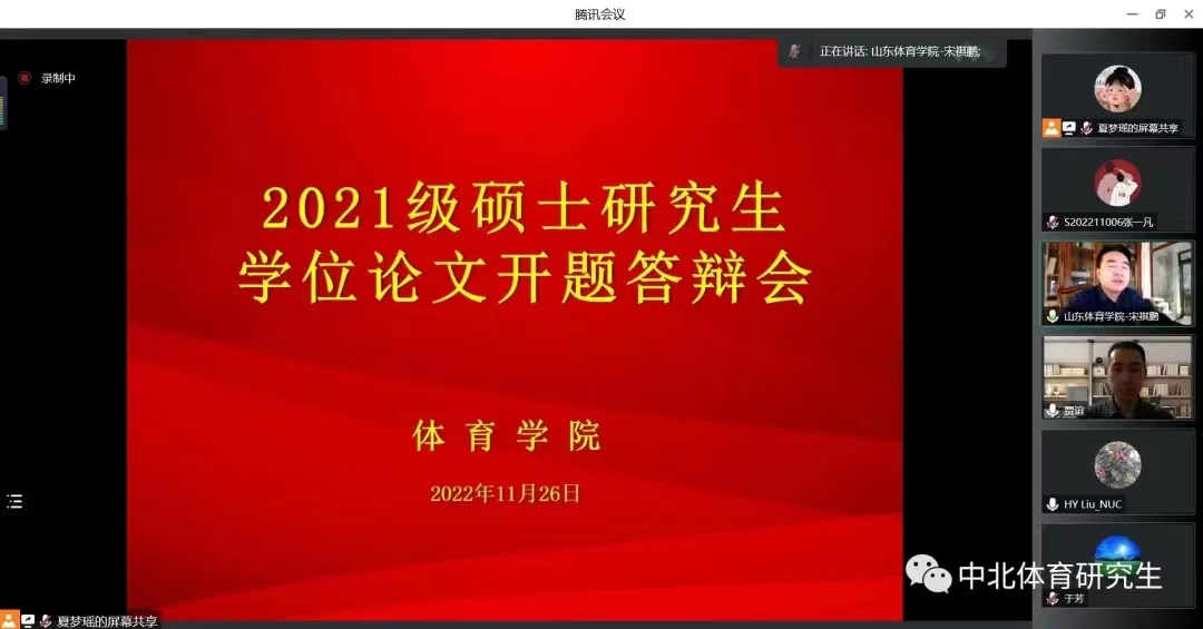 11月26日,足球现场直播 2021级硕士研究生学位论文线上开题答辩会于线上腾讯会议举行。开题答辩会特邀山西大学博士生导师李金龙教授、山西省体育局体育科学研究所董建国研究员、山东足球现场直播 硕士生导师宋祺鹏教授、忻州师范足球现场直播 硕士生导师张翔教授担任各小组评委主席,各方向学科带头人、导师分别出席本次答辩会。全体2021级研究生参加线上答辩,2022级研究生进行在线旁听。